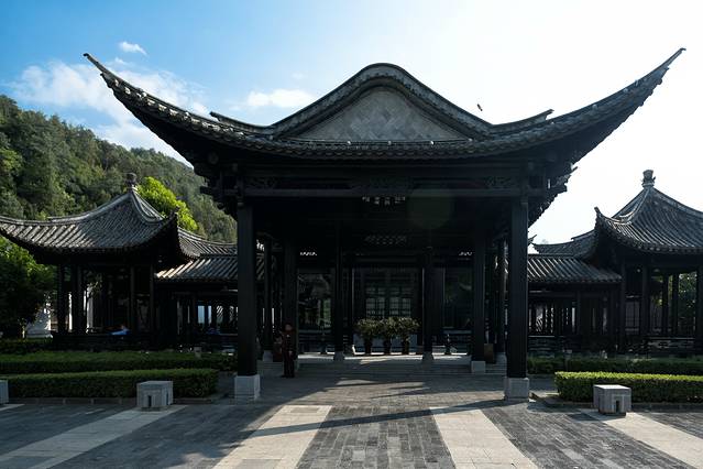 悦椿温泉大门,飞檐斗拱,开阔大气。