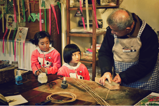 最精彩的还是那些手艺人,年画的师傅,寥寥数笔,一张活灵活现的年画就完成了。剪刀在师傅手里上下翻飞,一眨眼的功夫一张红纸,就变成了小猪的造型。风筝屋,一家人围着老师傅,画一只蝴蝶风筝,从小镇的广场上飞上天空。