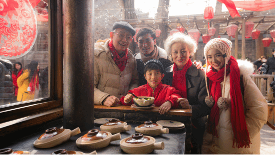 这个冬天,漫步在阳光晒暖的的古北水镇,舟船泊宿的河道上,落满长长的树影。灰砖黛瓦的屋舍间,雀鸟飞上了天空。鸳鸯湖水库氤氲着白色的水汽,日月岛广场上已经热闹起来,踩高跷、扭秧歌,一场盛大的长城庙会,召唤着一次年味的回归。
