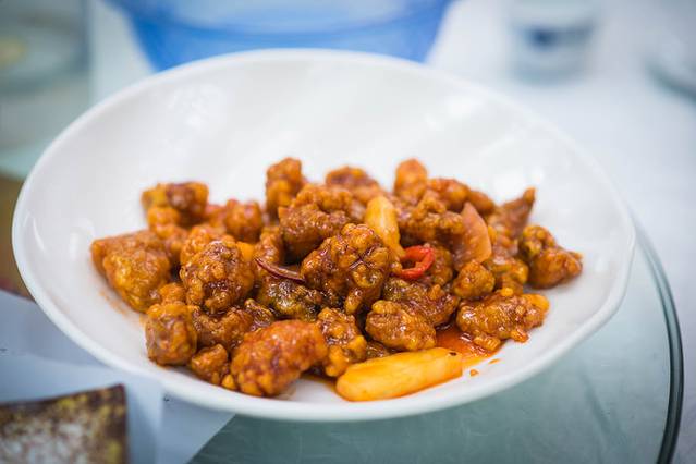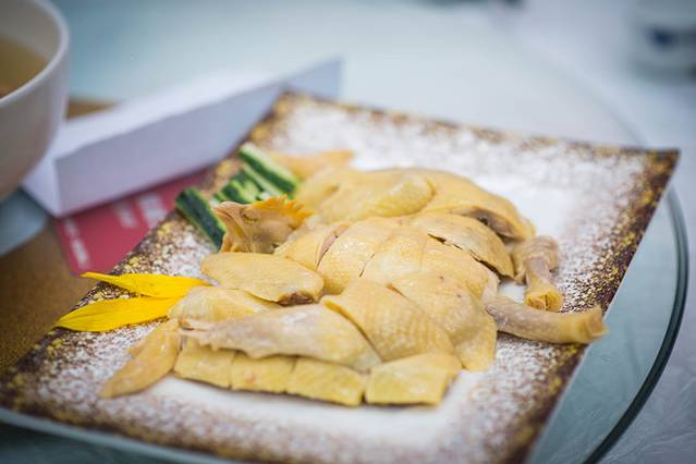 葵花鸡皮黄、骨脆、肉甜嫩,这是它的特点,白切葵花鸡是最佳的吃法。我正好奇,平时的白切鸡都有酱油可以点,葵花鸡怎么没有呢。询问得知,为了保证鸡肉的鲜美,葵花鸡不用添加任何色素任何酱料,保持原汁原味,如果是会吃鸡的食客,一定能吃出鸡肉原汁原味的香味。