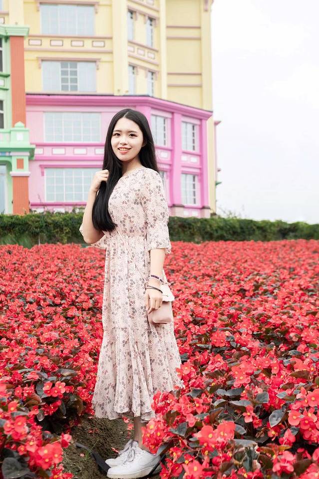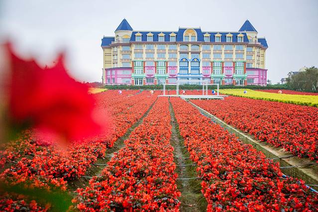 在这一片世纪彩虹的花田中,远处是外墙五颜六色的花之恋酒店建筑,虽然天气并没有蓝天,但是因为有了暖阳,还有芬芳的花香,这暖暖的气息,让人感觉到无限美好。