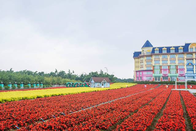 鲜艳的海棠花花海,搭配着黄色和红色,就像是大地上铺满了黄色和红色的地毯。游客还可以体验搭乘小火车,穿行在这些花地毯中,还以为自己来到了春天的怀抱里。