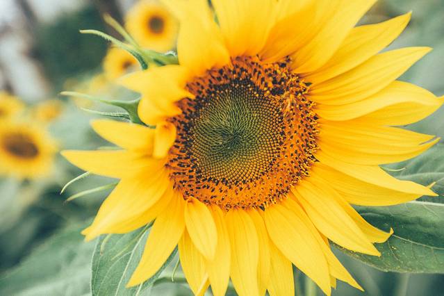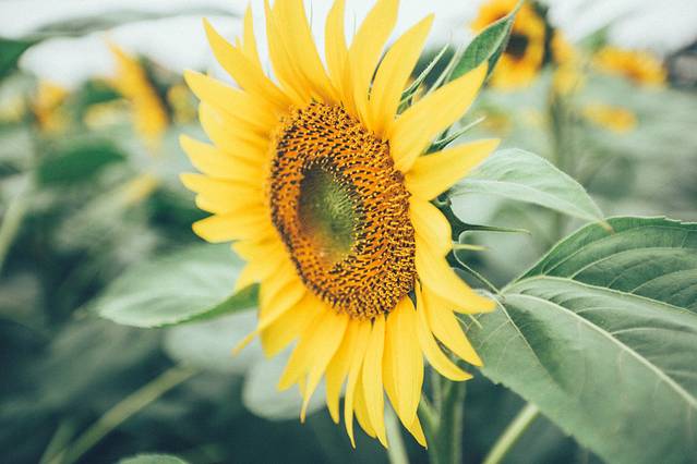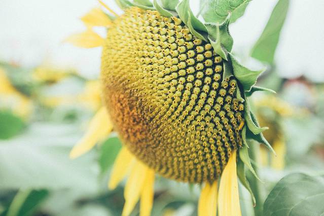 另一边有一些相对来说比较矮的向日葵,这些向日葵是成熟可以取葵瓜子的,它们中间的花盘可以看出清晰的一颗颗的葵花籽,从这里采摘下来的葵花籽,炒熟以后就是我们平时最爱吃的瓜子了。