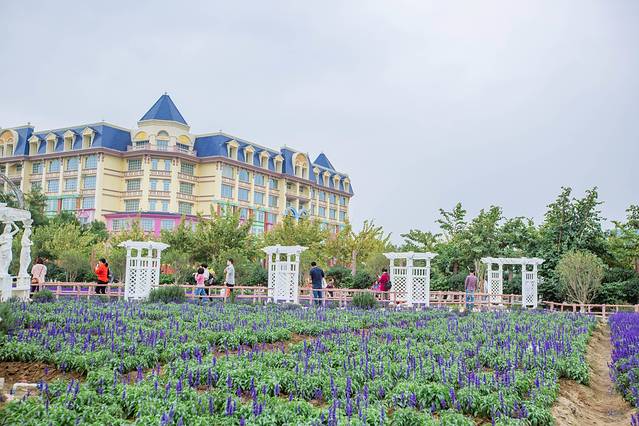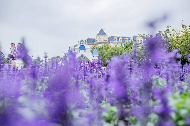 薰衣草花田后方,是漂亮的花之恋酒店,七彩的花之恋酒店在背后,成了绝美的背景,相互配合成完美的景致。
