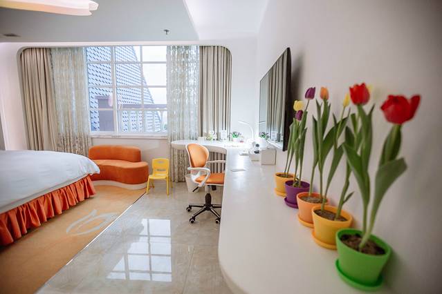 柔软的床铺,干爽的被子,枕头还用绣花嗅着郁金香的花纹,凸显出房间的主题特色。房间还摆放了几盆郁金香,五彩的郁金香给房间带来了清新的活力。
