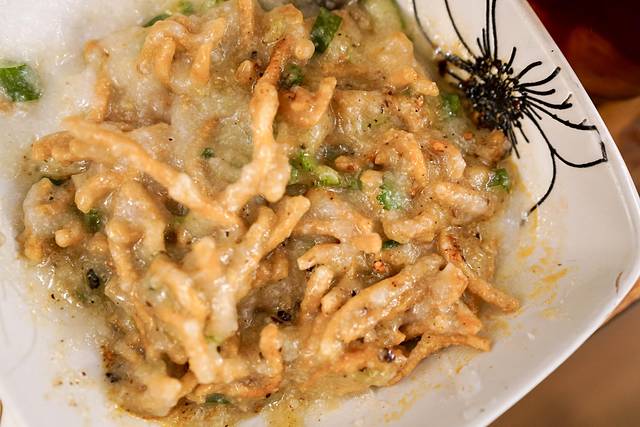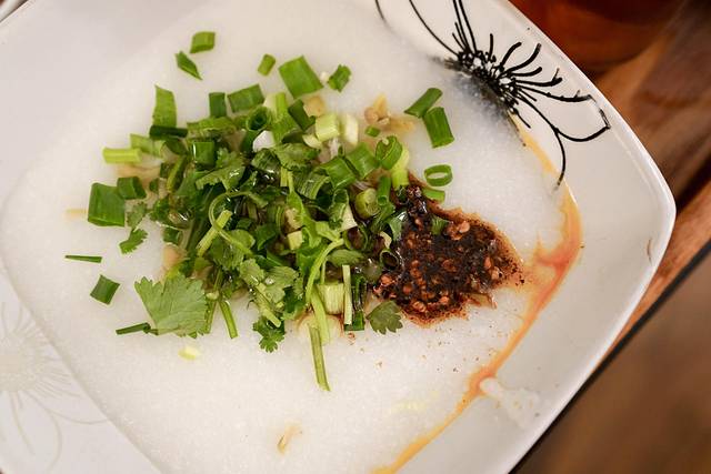 油茶的原料是一碗白米糊,撒上香菜、葱花、酥黄豆、榨菜、盐、花椒和重庆人离不开的辣椒油,再将一碗香脆的面条倒进均匀搅拌(说是面条,更不如叫它干脆面),吃在嘴里很特别,我和巴黎小姐都被这味道深深吸引,今天也算是尝新了