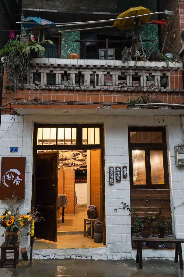 巷子两侧是参差不齐的二层老旧居民楼,过往的行人很少,三步两步就能遇到一处隐匿的“文艺”居所。有山间民宿、日料餐厅和改造过的文艺商铺。它们是喧闹街市背后的市井生活,也是老重庆的生活掠影。