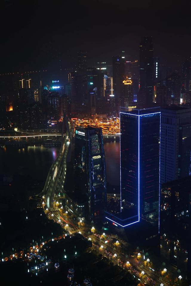 酒店的两江夜景。白天雾气蒙蒙的重庆一到晚上被灯火点亮的时候可以清楚地看到对面的高楼大厦。千厮门大桥和洪崖洞一览无遗。