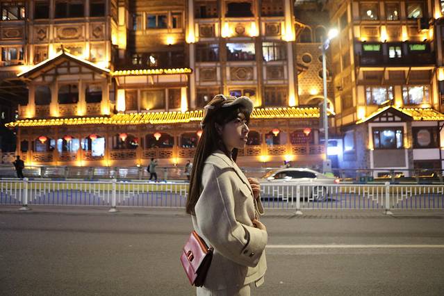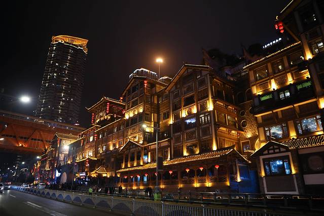 1、洪崖洞一层对面马路:入口人爆多,可以拍人像和行驶的车水马龙,缺点是需要等来来往往的人群