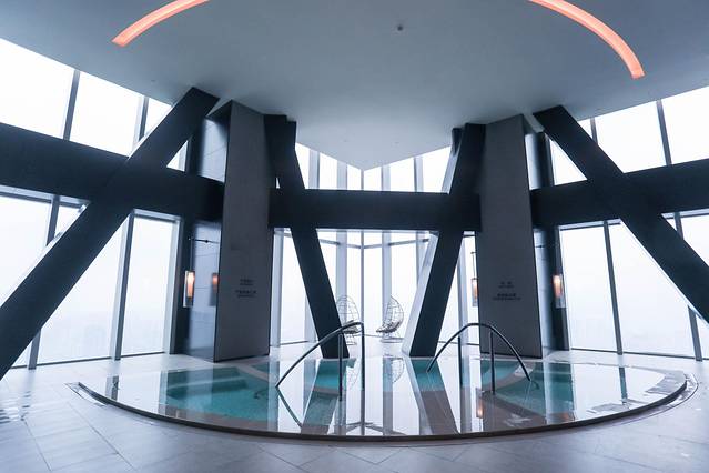 天际泳池,冬天的重庆有些阴天,听说夜景是相当美的,窗前的两个鸟巢椅是很多网红小姐姐喜欢凹造型的地方哦。