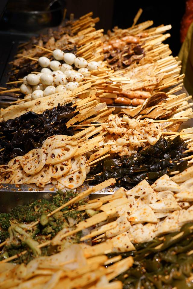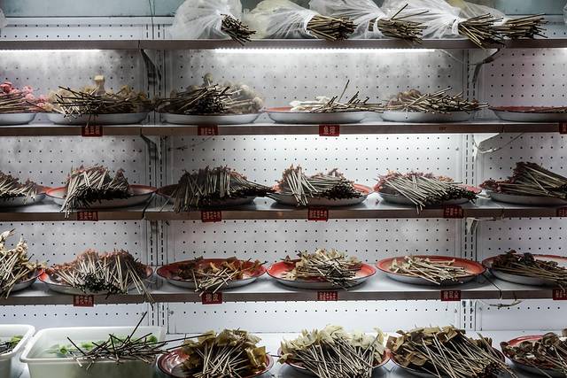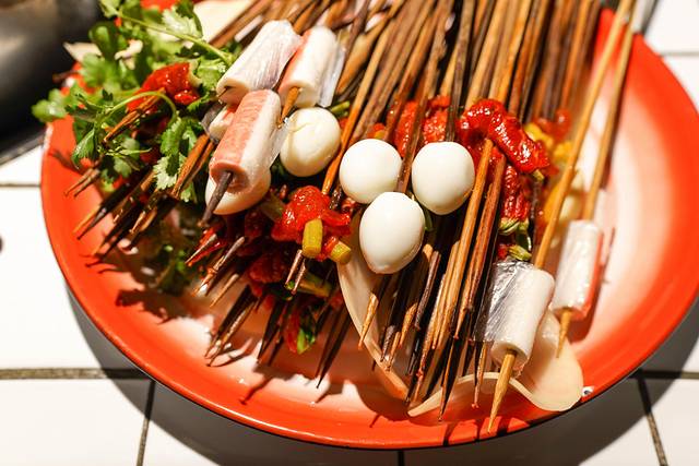 串串的竹签最后按重量结算,桌子上有专门扔签字的签筒很方便。串串自然以全牛肉为主打,但是贡菜、鹌鹑蛋、土豆片、蟹肉等等也是应有尽有。