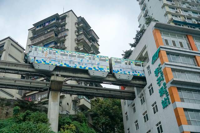 花上2块钱车票,从曾家岩上车,走向车头,这会的车头内已经有不少人拿起手机等着拍摄列车钻进李子坝站的影像了。其实曾家岩并不是总站,如果再往前一站上车,最佳机位肯定就是我们的了。不过曾家岩站也并没有太差。当列车开出的时候,一路顺着桥梁开到桥下,再爬到坡上,一侧是密密麻麻的居民楼,一侧是开阔的江景视野,重庆的单轨列车果然没有辜负我们千里迢迢的专程打卡。