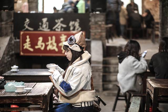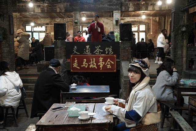 一门之隔,确是与外面不同的景象。破旧的房梁、擦得发亮的四方老桌、不平整的水泥地面甚至还有来不及清扫的茶水和瓜子皮儿,正中间不大的区域是茶馆的民间艺人,嘈着听不太懂的重庆话给客官们讲着民间有趣的段子。