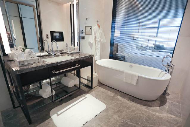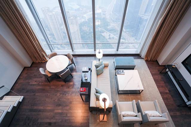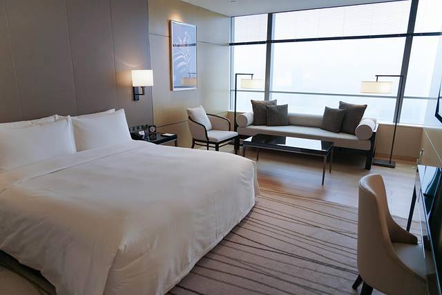 很幸运第一晚被update到了套房,一共两层。一层是客厅,二层是卫生间和面向江景的大床,VIEW赞到爆,不过之后就要搬回普通客房啦。整个酒店属于性冷淡风一派的,白天的景观虽然没有晚上明艳动人,但是拍拍人像还是很满足,分分钟ins博主的感觉!