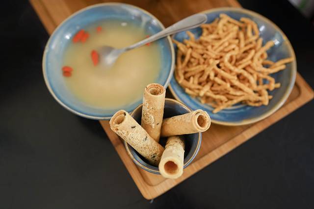 大王油茶经典套餐:油茶+酒糟汤圆+鸡蛋卷。还是第一次见到套餐里有鸡蛋卷的。很像早餐又很像下午茶,这种做法确实很特别,至少给略显疲惫的我们补充了些元气