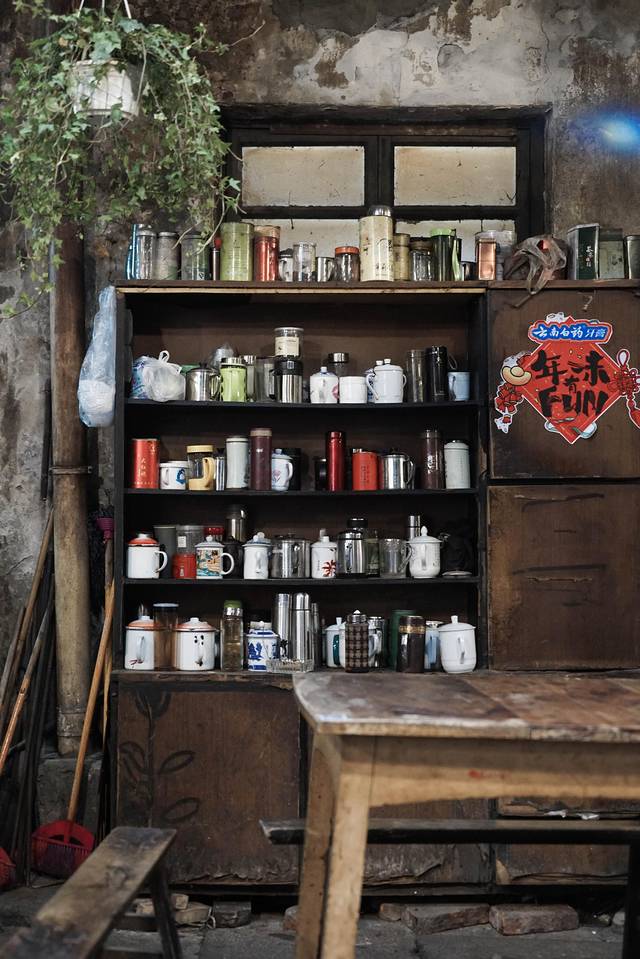 有些老茶客自带茶叶,将杯子摆在旁边残破的茶柜上,来这里就好像回家一样。希望这里在未来依然保留着那份旧日情怀,走过每一个三十年。