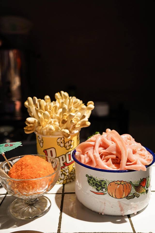 黄金虾滑、一桶花生苗和盅盅鸭肠面。别看虾滑是小小的冰激凌杯,涮出来可是分量不少,嫩嫩的虾滑吃在嘴里口感超赞。一桶花生苗用爆米花桶盛花生苗也真是没谁了,放一块还是挺有画面感的