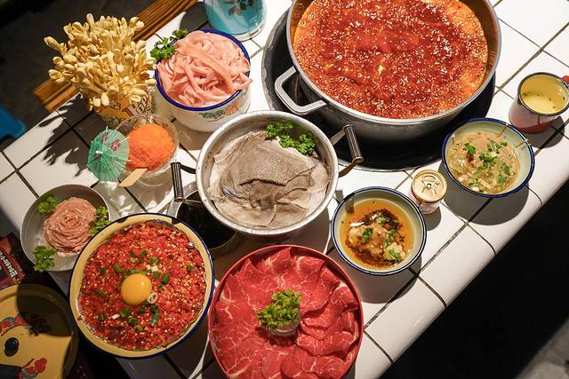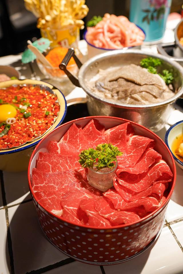 告白牛肉、黄金虾滑、雪山牛舌、一桶花生苗、牛一根、玫瑰松板肉、怒火蒜香酥肉,一看菜单这些名字就足够噱头了,菜品端上来的时候真是艾玛太有个性了!!那些90年代的老锅盘器皿也太能撩人回忆了,而且每个菜都不同,摆满一桌子吃的才是回忆啊!