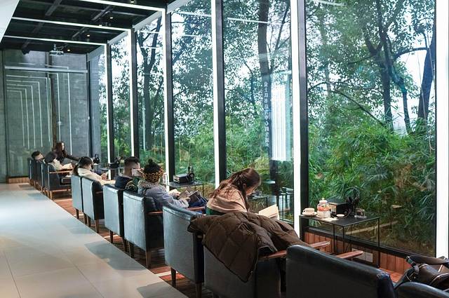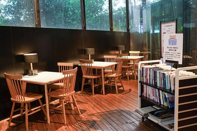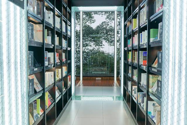 南之山的书店有点隐居森林之中的感觉,很像北海道星野里面的森林餐厅,面向山林的通透大玻璃窗,当然那些“雅座”肯定会早早就被占据。书吧内休闲区都会被大小书架包围,一转身就能挑选想要阅读的书物