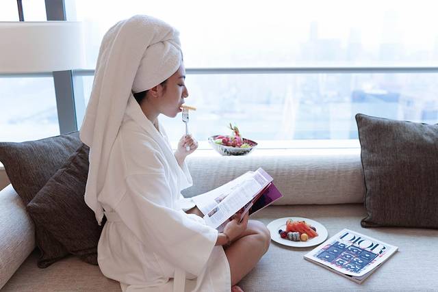 经常看到很多ins博主的酒店大片都是一水白色浴衣和包头浴巾!这两个酒店都有提供,配合景观玻璃窗和手中的道具,高级质感大片很容易出炉啦!