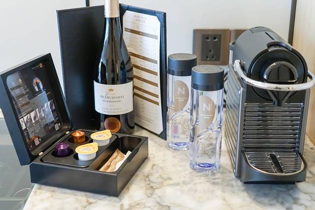 迷你吧的胶囊咖啡和饮用水高级许多,红酒是付费的