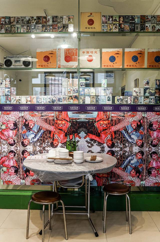 说起江湖,那这里真算是老江湖了,七八十年代的装修风格不刻意又有归家的感觉。几张折叠桌椅,铺上白色塑料布,中间围着烟筒,四周的橱窗里是邓丽君刘德华那个年代的老是卡带和录音机,夹杂着几本教科书,再贴上几张奖状,这些都是少年时代最值得炫耀的宝贝。吃个饭好像来到了时光博物馆。