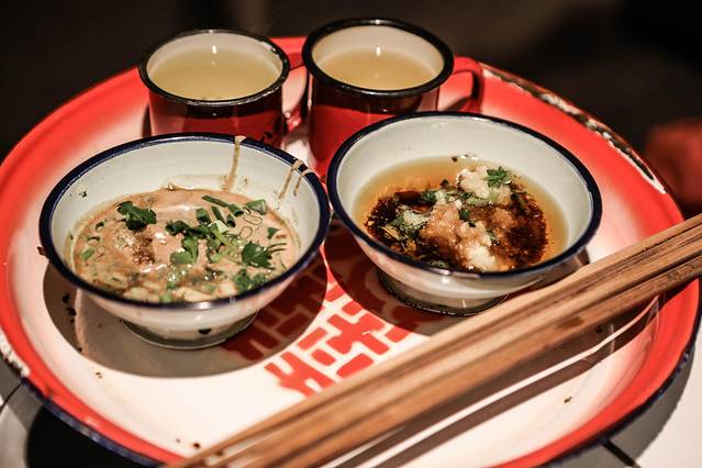 调料和茶水在一层自取,放在一起的时候巴黎小姐说这这一碗麻酱一碗麻油就可以看出吃饭人是哪个地方来的了。嗯我来自北京,她来自成都。