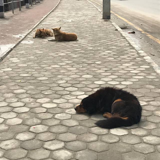 路中央睡得一塌糊涂安逸狗狗们