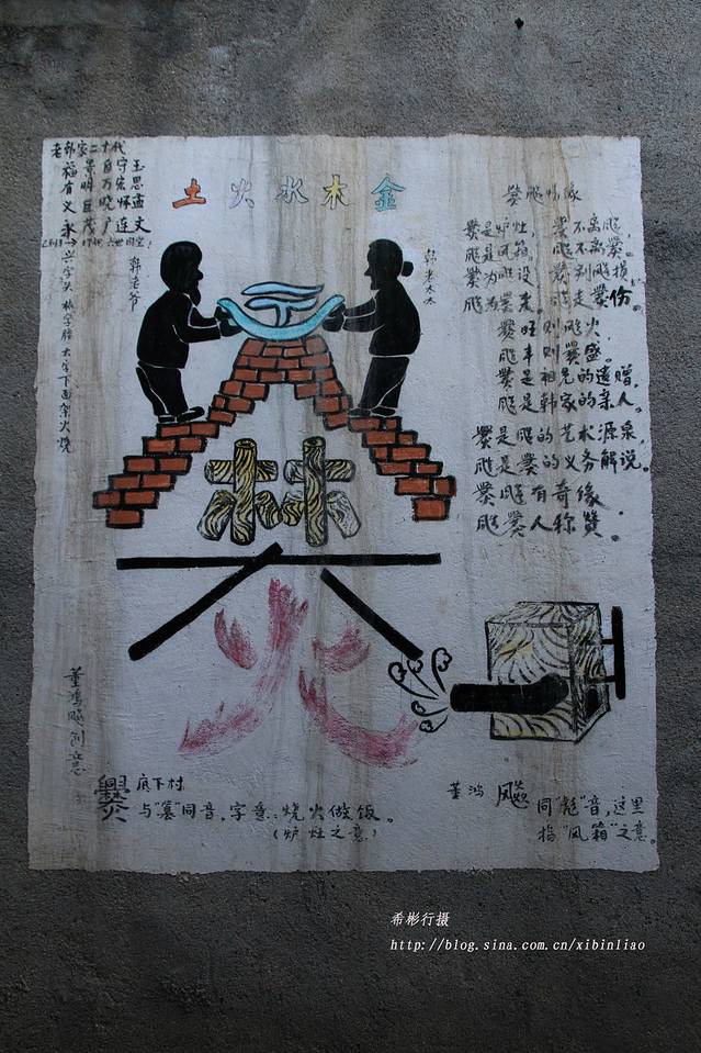 这是我2014年1月底两次来到爨柏景区,主要是欣赏一下古村的建筑,我在一户人家的外墙上看到了一幅对“爨”的解释说明。兴字头,林字腰,大字下面架火烧,大火烧林烧的兴,岂不很热?所以姓寒,谐音寒。
