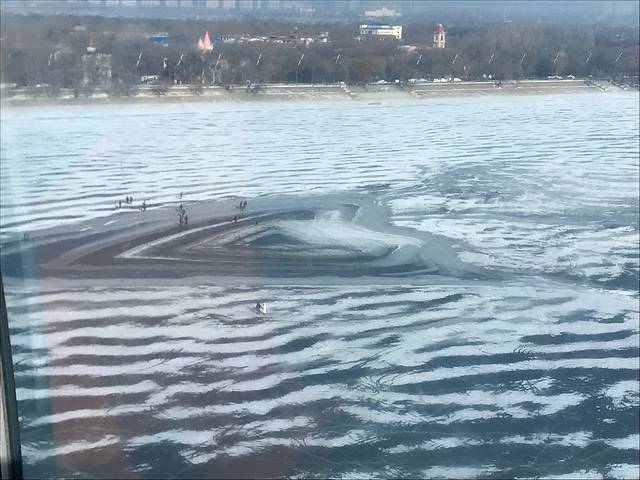 坐在缆车里,看松花江,真想下去踩踩冰面。