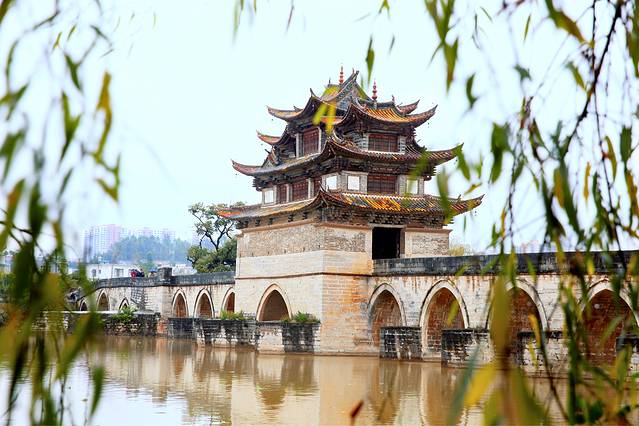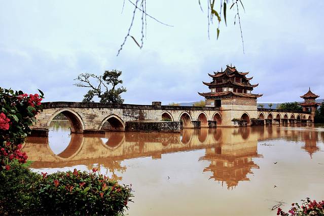 双龙桥,横跨泸江与塌冲河交汇之水面上,于乾隆年间开建,先建了三孔,道光年间又建十四孔与之相连,俗称“十七孔桥”。