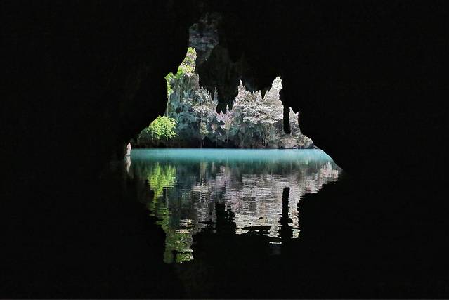 洞内弯弯曲曲一片漆黑,讲解员用手电筒照着洞顶和石壁,才发现有大量的生物岩洞和垂直丛生的钟乳石。