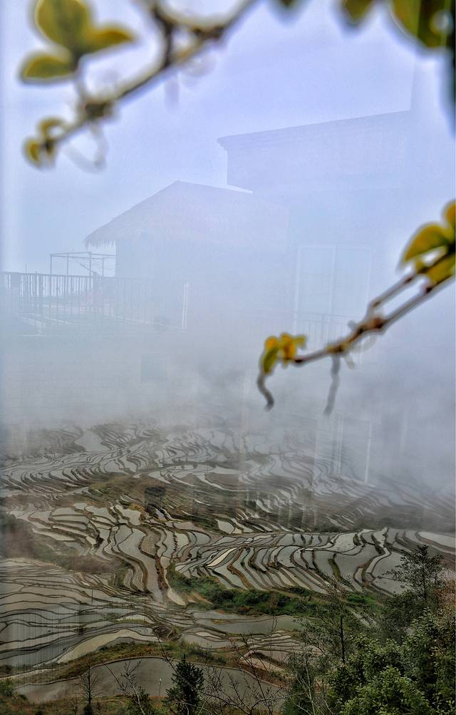 隔着窗户玻璃拍摄,房屋倒影于梯田之上,如海市蜃楼,美仑美奂。