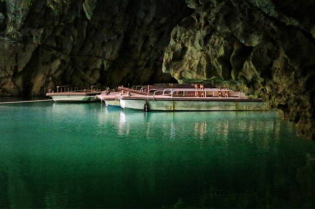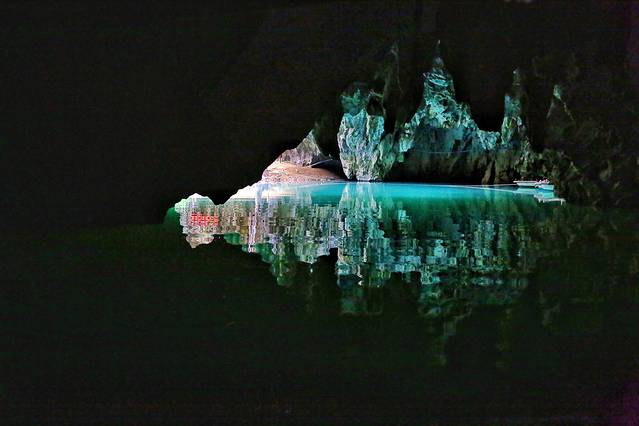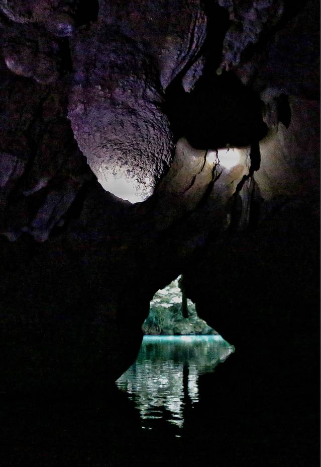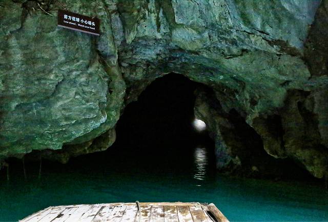 第一道门隐藏在岩壁下,只容得下一条小船通过。正当佩服冬泳爱好者时,讲解员让我们试试水温,20度左右的湖水,冬暖夏凉,惬意的很。