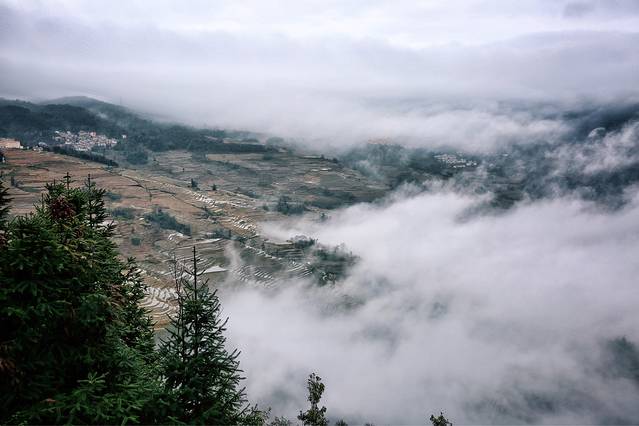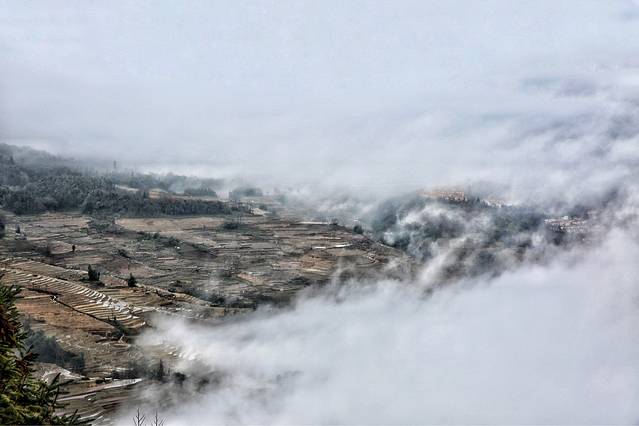 这种天气不可久留,还是往回走吧。到达坝达梯田入口,白雾茫茫,我仍不死心,还是决定走到观景台,碰碰运气。