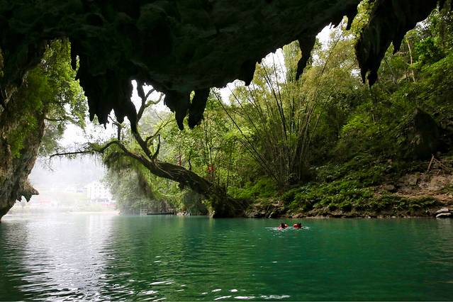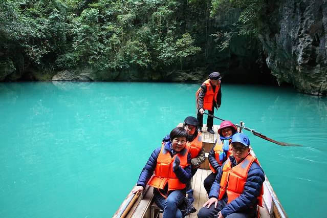 凤山三门海是世界上唯一的水游天坑景区,这里发育有七个岩溶天窗,并以坡心地下河出口洞段形成的数平方公里面积的明湖和暗湖串在一起,目前三个天窗有自然通道,可以乘船入内。