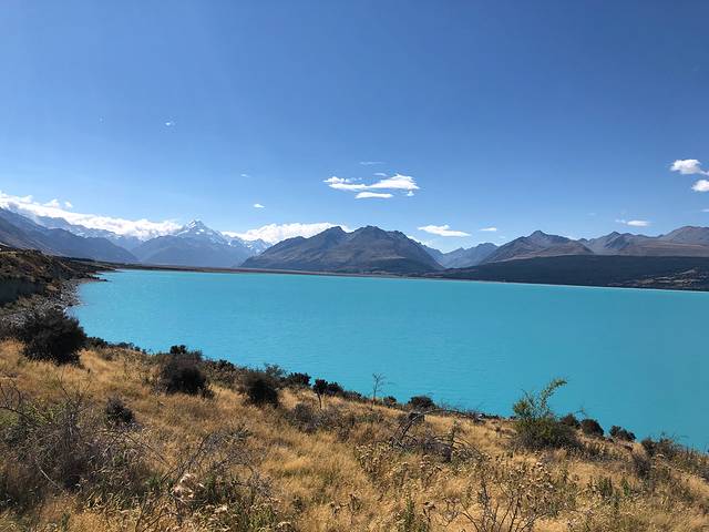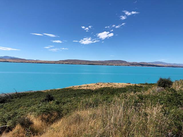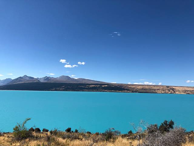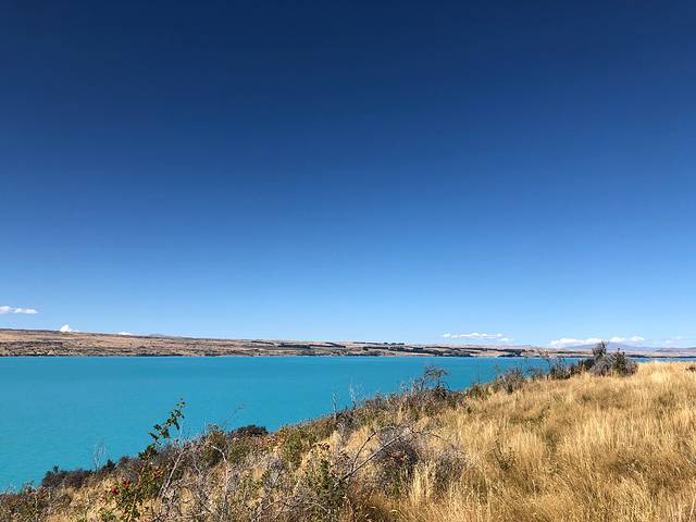一个自认为是新西兰最美的湖——普卡基湖,这蓝到窒息的大湖,实在是令人惊叹!今天的路线都是绕着弯在湖边行驶着,实在太美了。湖天共一蓝,映着那股纯,净得出奇。
