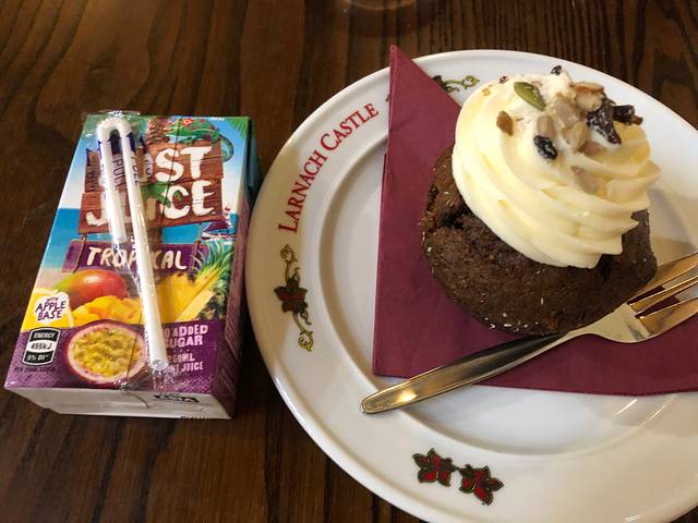 午餐在城堡的宴会厅,喝just juice的混合果味果汁+蛋糕
