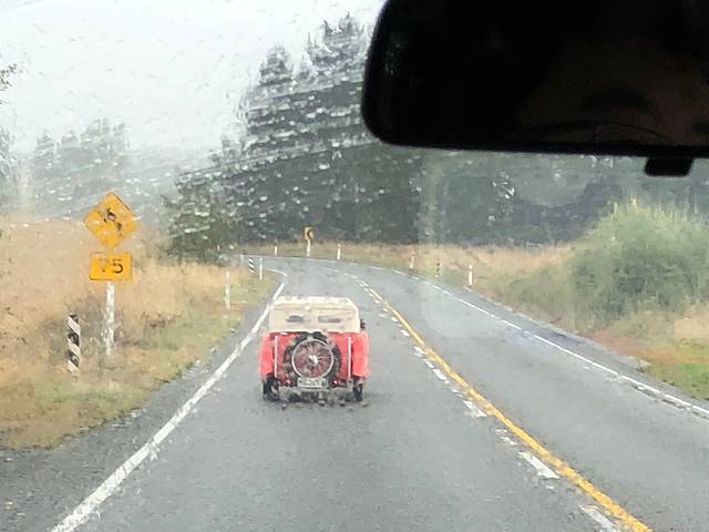 粉色的老爷车,行车途中一直下着雨。期待明天开始会有好天气