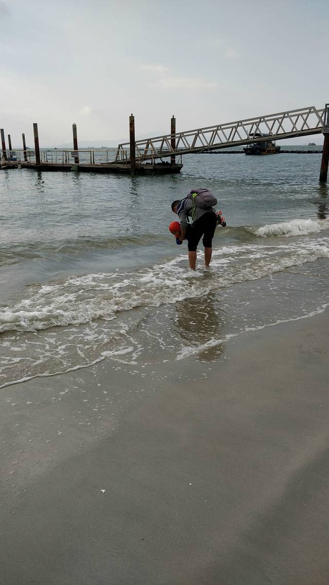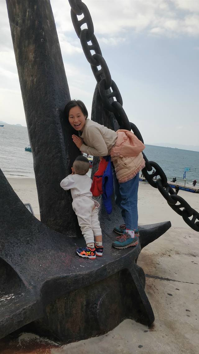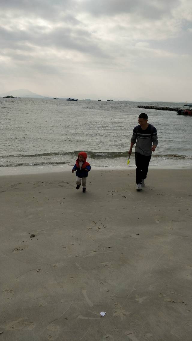 步行了几百米后,到达沙滩,那里风景美不胜收。首先看到的是个大锚,儿子直接爬上去玩。走在沙滩上,那些沙子细得和我们平时吃的盐几乎一样大小,非常的轻柔。海水清彻见底。儿子开心的直接趴在沙子上面,在那里不断的拨沙子,甚至还在上面打滚。我也忍不住脱了运动鞋,在沙滩和海 水里 面走。妻子在一边拿手机,给我们拍了些视频和相片,还和儿子坐在沙滩上玩耍。此时海风轻轻袭来,远眺远方的海水和蓝天,海天一色,让人无比陶醉。另外,我们还注意到了一点,来这里旅游的游客,大部分都是老年人,很少有年轻人,就更不用说像我们这样的家庭户了。在海边有一个游乐场,现在是淡季,没有人营业,里面很多的游乐设施是可以玩的。儿子最喜欢玩的,是滑梯。在这里遇到两个 四川来的老人带着孙子在玩,小家伙们跑上跑下的,自己从楼梯上去,钻进滑道,“嗖”的一下就滑下来,玩得不亦乐乎。过了一会,他看到那个小哥哥去坐观光车,他也要坐。去问司机,说要20元/人,小孩要10元。我和他说:“我们两个人坐,小孩还这么小,就不收钱了吧。”结果,花了40元,我们仨看了一圈巽寮湾 的风景。儿子坐着坐着,就睡觉了。在车上睡了一会,等他醒来时,已是4点多,我们一起在附近逛逛,儿子喜欢吃海苔,我们买了一包,才10元。儿子又看到了一个吸水管玩具,我一问价格,要20元,太贵了。然后我又问旁边那个吹泡泡棒多少钱,店主说10元。我们直接走开了。因为平时那个东西只用3元就可以买到。经验之谈:如果到一个陌生的地方,你不清楚那里的东西卖得贵不贵,只需要问店主那些平时你经常买的东西是多少钱,就能够知道了。他们这里的东西,足足比平日市场上的贵两三倍,不值得。
