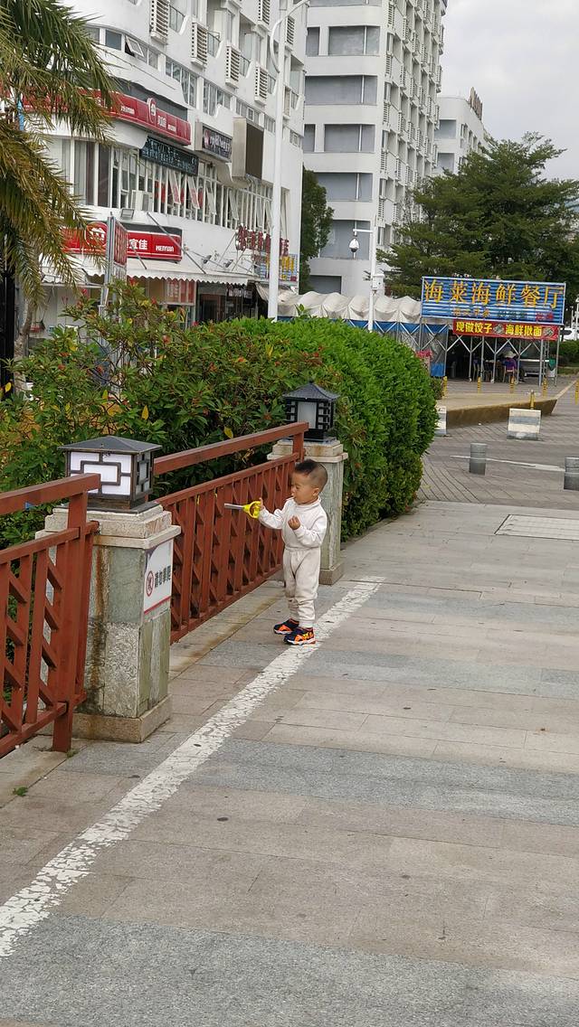 12月27号,早上10点半,行李收拾妥当。带上儿子,从 东莞 塘厦出发。在高速上开了2个多小时车,终于到达了 惠州 海湾大桥。从桥上望去,整个海湾风平浪静,风光无限美好。过了大桥,出收费站用了51元。大家肚子都饿了,在路旁的海鲜大排档吃了顿海鲜,花了165元。在这里提醒大家,如果带着小孩子去(3岁以下),吃饭时一定要给他坐在婴儿凳上,而且要做好心理准备,小孩能够专注吃饭的时间最多也就十来二十分钟左右。这段时间,能给孩子喂多少就喂多少,我们吃饭也尽量快点。带着小孩是没有时间好好享受的。儿子看啥都新奇,在餐厅里一会拿网兜,一会抓沙白(海产),玩得不亦乐乎。吃完饭后,继续开车,不一会,就到达 巽寮湾 ,大概是下午1点左右。儿子急不可耐的跑下车来,一会坐坐这个,一会碰碰那个。说出来你还不相信,这小家伙最感兴趣的就是垃圾桶,一路上看到了都要指给我们看。