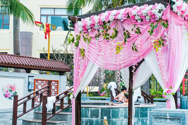 喜欢古风的,可以在唐风区感受一下,华丽的纱幔、古色古香的装饰,极富大唐风韵的泉池尽显隆重与尊贵。