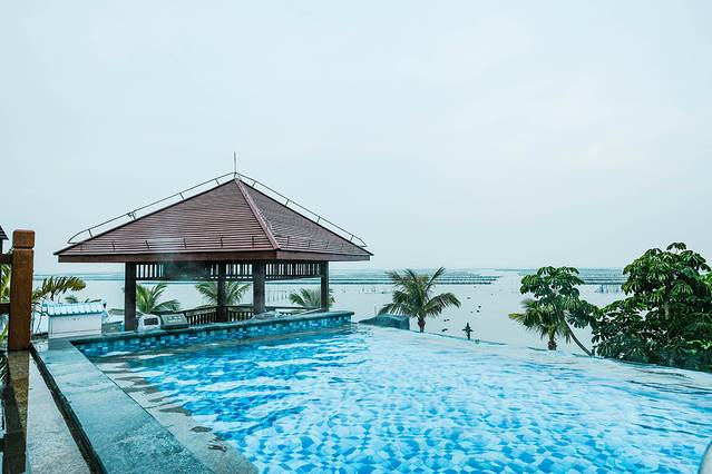 中心温泉区宽阔的浴池,池水清澈,不仅可以泡温泉,还可以畅快的游弋其间,左手是整个园区的美丽景观,右手即是大海。