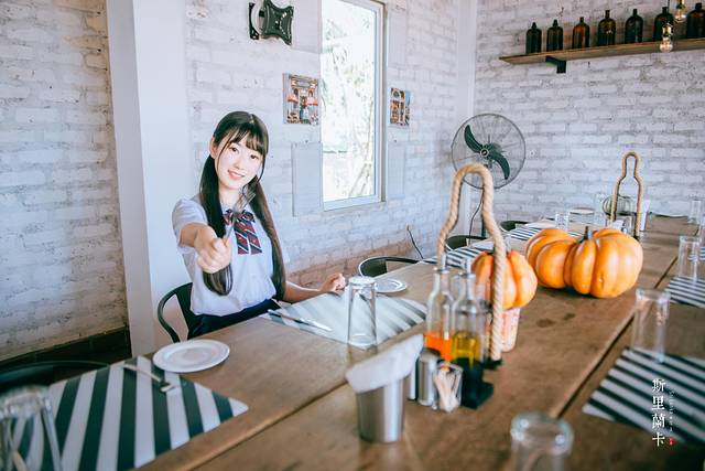 店内二楼有一条长长的桌子,大概是当地人聚餐时的场地,木色的桌子上摆着黑白条纹的餐垫,以及南瓜灯装饰,桌子上放是北欧风的吊灯,整个房间的墙面漆成白色,墙上还有许多简单却很精致的装饰。此时店内除了我们并无他人,拍照也不用担心会影响到他人。