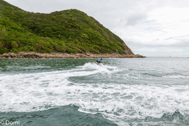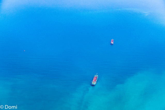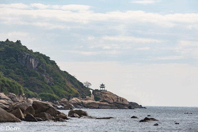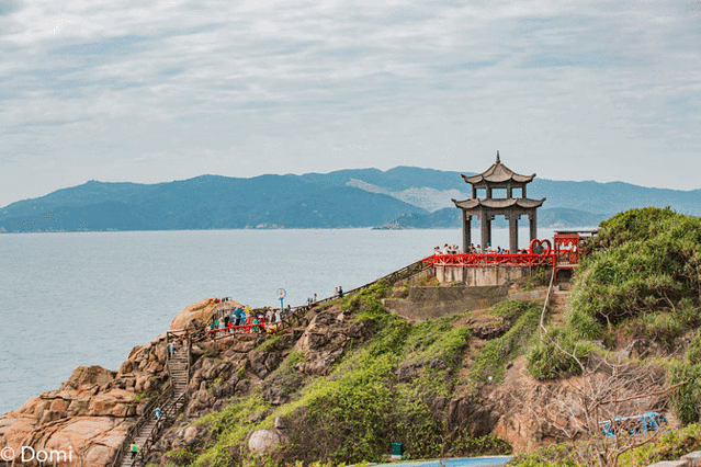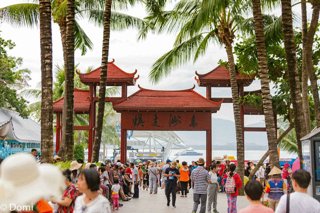 买票,排队检票,然后坐上做过很多次的小邮轮,在海水的拍打下摇摇晃晃昏昏欲睡的度过了舒适惬意的十分钟。上岸后的景色似乎有些微妙的变化,这些看不到的人们乌央乌央的出现在我的眼前,远处的岛屿上是延伸至海里的游客……