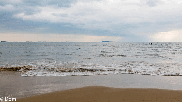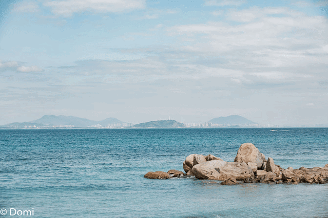 伫立在楼顶,眺望着宁静而辽阔的海景,一排排翠绿椰林环抱沙滩,蓝天、碧海、青山、绿椰……感受晶莹如镜辽阔的海面,松软的沙滩,叠印着蓝天、白云、岱山的倒影。远处水天一色,似有若无的浪花,三三两两的渔船缓慢地滑行……