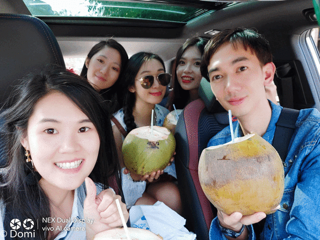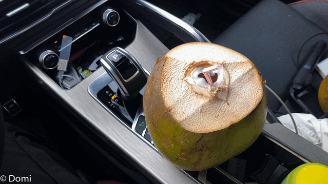 准备就绪后打算直接开车去观澜湖冯小刚电影公社,刚出发的路边不乏售卖椰子的小商贩,5到10元一个,大多数是7元。商量了一下25元我们5个一人抱了一个大椰子!幸好车的空间够大,中控的位置刚好放下这个比我脸还要大一圈的椰子!不然真的要喝完才能开车上路了……