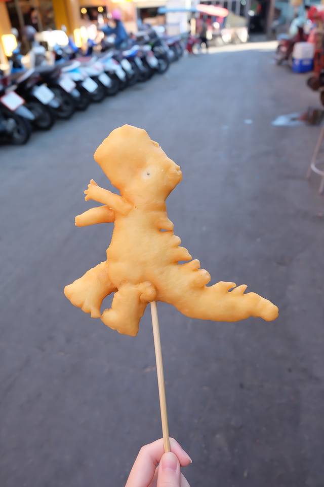 在清迈吃恐龙油条:对于不想吃得太饱的人来说,油条和咖啡是泰国人早上喜欢吃的另一种食物。其实泰国全国都有油条卖,但最有名的在清迈。它是恐龙形状的油条,又大又可爱,适合拍照。