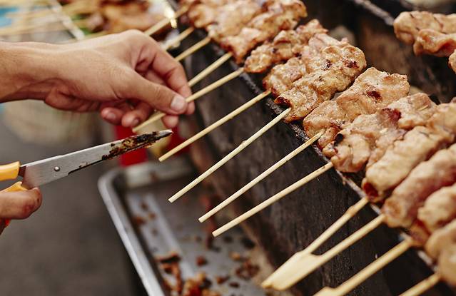 早上吃烤猪肉串配糯米饭:在其他国家早餐可能是米饭、粥或美式早餐,对吧?但在泰国,泰国人喜欢吃的早餐就是烤猪肉串配糯米饭。为了增强饱腹感,泰国人会吃丰盛的早餐。烤猪肉串配糯米饭就是一道!泰式猪肉串配热糯米饭真好吃!