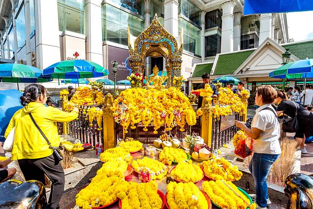在拉差帕颂十字路口拜四面佛:拉差帕颂十字路口的四面佛是泰国人和中国人信仰的神圣,如果去曼谷,不要忘记去这里许愿。人们说许什么愿都会成真。我推荐大家在四面佛庙内买供拜的物品,因为比在外面买便宜。